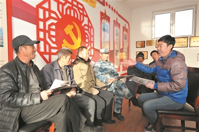 23日,市选派干部、云冈区西韩岭乡南湾村党支部书记刘志文,通过读报、张贴宣传海报等方式,学习、传达党的十九届五中全会精神,让党的富民政策家喻户晓、入脑入心。 本报记者 于宏 摄