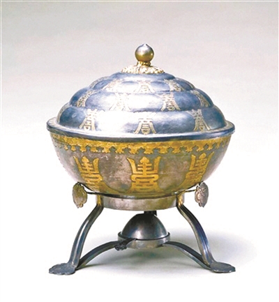 在发展进程中,火锅的造型基本大同小异,下可盛炭火保持汤锅沸腾,上可尽煮各种食材,更注重器皿的实用性。到了清代已是集大成,尤以宫廷制造为最,无论铸造材质之考究、做工之精细、造型之完美均属上乘。从旧藏实物来看,其质地有金、银、铜、锡、铁等多种,造型配件上,除了锅、盖、烟囱等组成部分外,还加上了底座托盘等复杂套件。纹饰方面多见各式镂空、动植物纹样和“福禄寿”“龙凤呈祥”之类的吉语。更因为清代宫廷对火锅的需求,使得工匠们无所不用其极,也客观上推动了火锅制作的创新。比如清宫用来温热食品的御膳器皿——火碗,就是一种更精致的火锅,普遍造型小巧,类似于现今的小火锅,这种器皿大都由三部分组成,火碗、三角支架和小银酒精碗,每部分可以分开。碗盖及碗身錾刻有寿字,三角支架设计为如意形,无不充分体现出清宫器物纹饰上吉祥美好的寓意。
