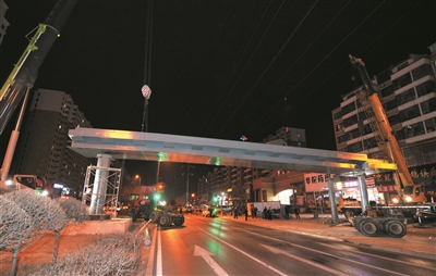 本报讯 (记者 辛雅君) 27日,经过施工人员7个多小时的奋战,绿洲西城人行过街天桥于当日凌晨4时许全面完成吊装,5时,封闭施工路段恢复通行。