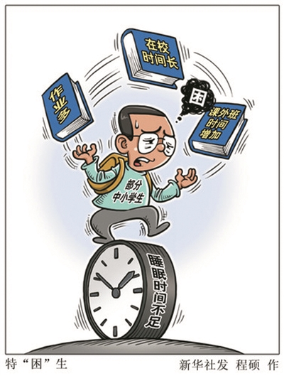 面对孩子们依然学业负担过重、中小学生普遍睡眠不足的现实,学校与家庭、老师和家长都应引起足够重视,按照各级教育部门的有关要求,切实采取科学有效的措施给孩子解压,合理安排学生的作息时间,让孩子们从“困顿”中解脱出来,一张一弛,有收有放,享有充分的运动锻炼和必要的社会活动,培养良好的生活习惯,形成乐观向上的心理状态,让他们都能健康成长。