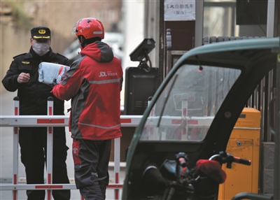 1月10日,在石家庄市新华区一社区门口,快递员在给社区派送快递邮件。