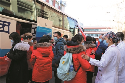 1月10日,亲友与同事在清华大学附属北京清华长庚医院核酸检测医疗队队员出发前送行。