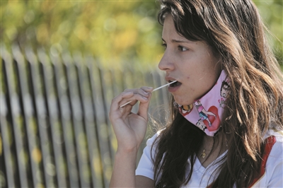 1月9日,在美国加利福尼亚州洛杉矶县圣加布里埃尔的一处自助新冠病毒检测站,一名女子从口中获取检测样本。