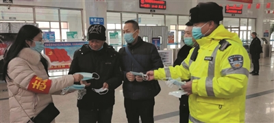 13日,市公安局交警支队六大队民警与市爱心志愿者御东学府团队,在大同汽车客运东站为旅客发放医用口罩。