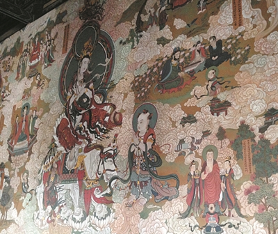 大同的壁画,多见于墓葬和佛寺大殿。沙岭墓群中保留一座北魏壁画墓,墓道、墓室墙壁和顶部均布满了彩绘壁画,是目前已知的最早的北魏壁画。壁画包括依仗图、宴饮图、伏羲女娲等,其人物服饰为汉式,房屋以庑殿顶为中心,旁边环绕游牧民族特有的毡帐,是一座见证鲜卑与汉民族融合的作品。辽金时期的壁画墓更是数量众多,在已清理的辽墓中就有近20座壁画墓,多常见髡发人物像,近半数的墓室棺上绘有彩色地毯,出行图常见驼车等,这些均有别于传统汉人农耕文化的塞外风情。佛寺大殿壁画中以华严寺大雄宝殿的21幅清代壁画最为著名,其色彩艳丽,画面内容丰富,面积仅次于永乐宫壁画。