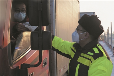 ▶ 1月14日,工作人员在绥化市城南高速口入城处对入城司机进行信息核查。