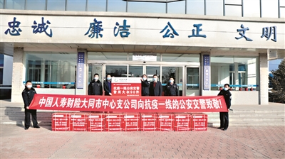 本报讯 (记者 丽华)为全力做好新一轮疫情防控工作,山西省公安厅交通警察总队高速二支队开启24小时值班备勤工作模式,尽心尽力守护群众安全。为了感谢他们的辛苦付出,1月27日上午,中国人寿财产保险股份有限公司大同市中心支公司工作人员来到高速二支队,为奋战在一线的交警送去90件警用大衣,向他们表达了最诚挚的敬意。