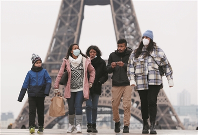 1月27日,人们走在法国巴黎埃菲尔铁塔附近的特罗卡德罗广场上。 法国近三周来陆续出现感染变异新冠病毒病例,一些专家呼吁第三次“封城”。