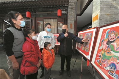 图为1月31日,小分队队员田德宏在东街街道为社区居民讲解年画知识。