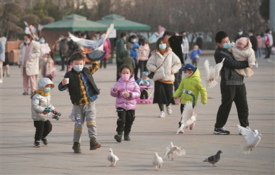 2月1日,几名儿童在石家庄市文化广场上游玩。