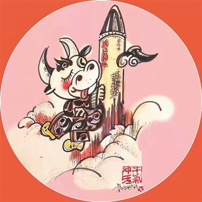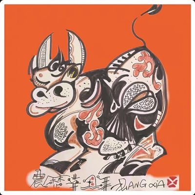 张侠漫画作品《牛气春天》系列作品分为“牛到福到”“牛爷来了”“牛气冲天”“牛年直播”等,水墨与写意并重,富有装饰性与趣味性。