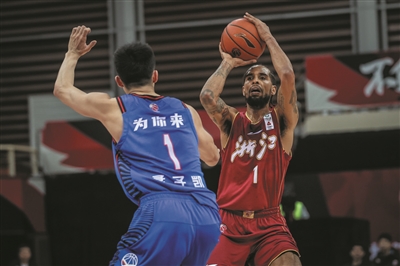 2月2日,浙江稠州金租队球员兰兹博格(右)在比赛中投篮。