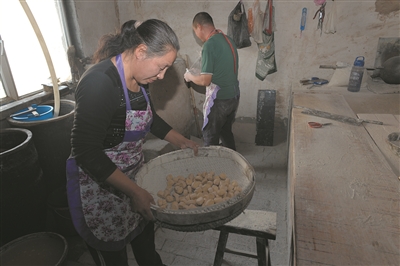 每年从立冬开始到腊月二十三,张爱军两口子每天凌晨4点左右就开始忙活,首先要给前夜发酵的黍米再次加水加温,2小时后流出糖水。“糖水过滤后倒入锅里进行熬制,这是最费时的,熬制到能挑起落片时,就要不间断搅动一个多小时,不然容易糊。”张爱军一边制作,一边向记者传授经验。