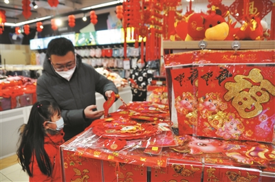 2月7日,一位父亲带着女儿在御河西路的一家大型超市里选购中国结。