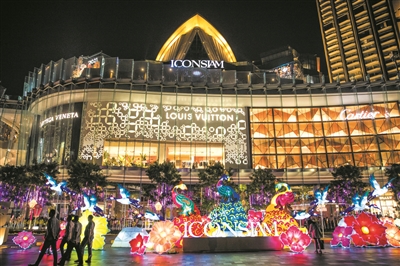 2月7日,顾客从泰国曼谷暹罗天地商场的花灯旁经过。