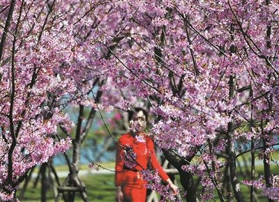 ◀2月21日,游客在上街镇沙堤村的鲤鱼洲樱花岛观赏樱花美景。