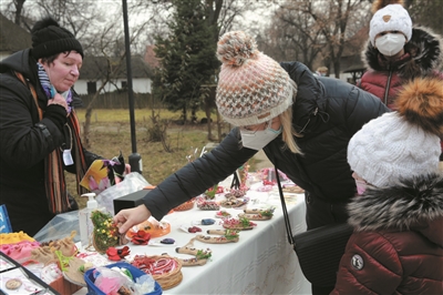 2月20日,人们在罗马尼亚首都布加勒斯特的手工艺品集市上选购传统小饰品。