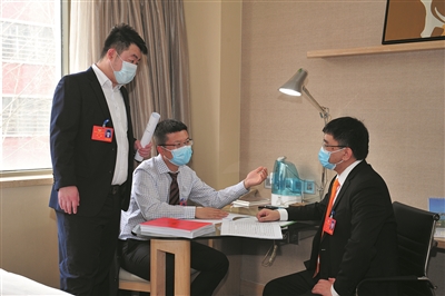 会议间隙,共青团、青联界别的许鑫(左)、刘如岩(中)、刘琨(右)委员在驻地就加强文化遗产和加快数字政府建设展开讨论。 本报记者 于宏 摄