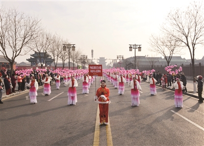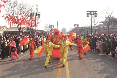 昨日,锣鼓声喧天,秧歌舞蹁跹。一大早,古城内和阳街、清远街就成了欢乐的海洋。金色的长龙舞起来,叮咚的腰鼓敲起来,跑驴、旱船、秧歌首尾相连争芳斗艳……形式多样的民俗文化活动让看红火的市民、游客大饱眼福。