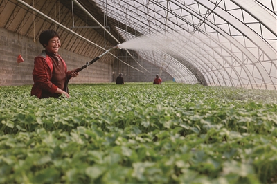 2月27日,唐山市丰南区一家育苗产业基地的工人在育苗温棚内为甜瓜秧苗浇水。