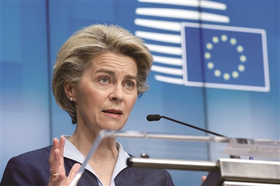 2月26日欧盟领导人视频峰会第二日会议结束后,欧盟委员会主席冯德莱恩在比利时布鲁塞尔出席新闻发布会。