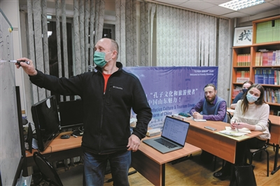 3月4日,教师在位于莫斯科的俄罗斯国立人文大学孔子学院为学生授课。
