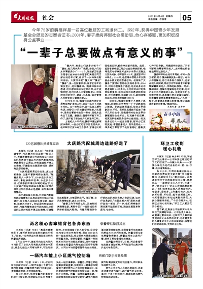 一位拄着双拐、身穿红马甲的七旬银发老人魏福祥,身残心暖,在长达30年的公益路上,如一束温暖的光,传递着社会向上向善的正能量(详见《大同日报》3月4日1版、《大同晚报》3月4日5版相关报道)。在3月8日到10日进行的阿里巴巴天天正能量第376期周评中,魏福祥的故事感动了合作媒体评委、正能量合伙人评委以及众多网友。11日,评选结果出炉,魏福祥的故事高票获得本期正能量周评奖,奖金5000元。这是天天正能量联合本报首次颁发该奖。