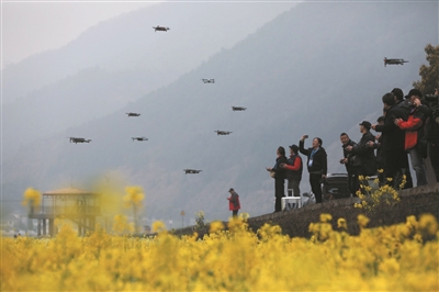 ▶3月21日,在桐庐县分水镇大路村千亩油菜花基地,摄影师启动无人机。