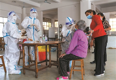▶ 3月31日,在瑞丽市勐卯镇勐卯村一检测点,医护人员采集一名老人的核酸样本。