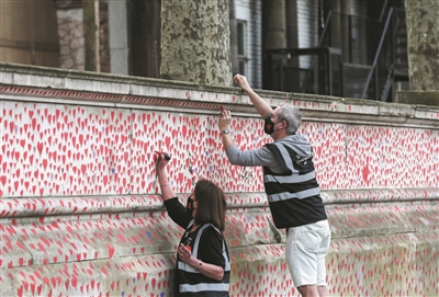 为了纪念在新冠疫情中去世的人们,英国伦敦议会大厦对面的泰晤士河沿岸设立了国家新冠纪念墙。逝者的亲友和志愿者从本周开始在几百米长的纪念墙上画上红色的心,每一颗心代表一名因新冠去世的英国人,表达对逝者的哀思。