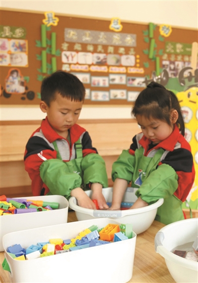 4月7日,河北省邢台市襄都区第七幼儿园的小朋友在清洗玩具。