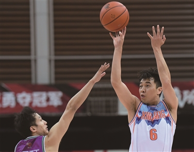4月11日,新疆伊力特队球员曾令旭(右)在比赛中投篮。