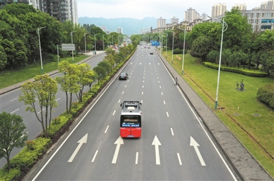 4月12日,自动驾驶公交车在永川城区内行驶(无人机照片)。