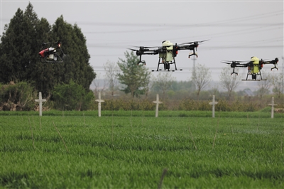 4月13日,植保无人机在陕西省兴平市一片麦田里进行条锈病防治作业。