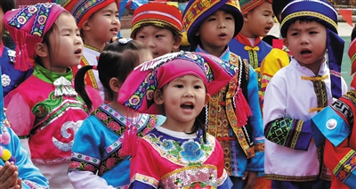 ◀ 4月13日,在广西贺州市幼儿园,身穿民族服装的孩子表演山歌对唱。