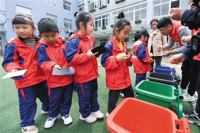 ◀4月15日,小朋友在党员志愿者的组织下参加垃圾分类小游戏。