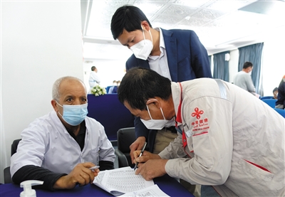 4月14日,在突尼斯首都突尼斯市,一名中国公民在接种新冠疫苗前登记信息。