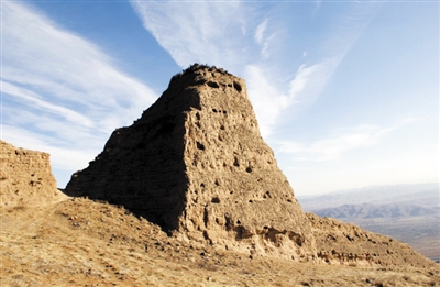 巨石实为山体的一部分,平面呈半圆形,最大直径约15米,东高西低,顶部略平。黄土夯筑的墩台建在顶部,东侧残高约2米,南北宽近5米。夯土层与石头的接缝清晰可见。墩台西侧已部分坍塌,露出底部的基石,大小不一的石块堆砌在巨石顶部,咬合紧密,上面存有墩台的夯土层。据此可推断当年修筑时,工匠们先以石块作为填充材料找平底部,夯实地基,然后才开始架版填土。