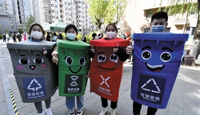 ◀4月17日,垃圾分类志愿者在金隅丽港城社区参加垃圾分类宣传活动。