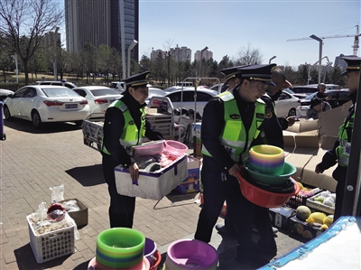 17日,在平城区永和路华北星城小区东门,执法人员发现两家超市将水果、日用品等摆在店外,执法人员将货物搬回店内,并告知店主不得摆在店外经营。在永久路太阳城小区外围,沿街门店将货物、广告牌、桌子摆在店外,执法人员对屡教不改的商户下发责令整改通知书,对其广告牌、桌子等先行登记保存。“对多次劝导仍拒不撤离的游商,将其经营工具先行登记保存,并对商贩批评教育、做出相应处罚。”执法人员李鹏飞说。