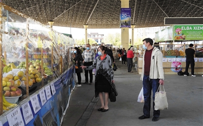 ◀ 4月18日,人们佩戴口罩在乌兹别克斯坦塔什干的一处市场购物。
