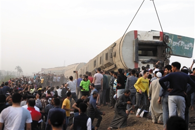 4月18日,在埃及图赫市,人们聚集在列车脱轨事故现场。