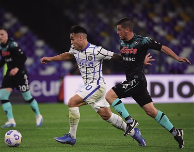 18日,在2020-2021赛季意甲联赛第31轮比赛中,国际米兰队客场以1∶1战平那不勒斯队。图为国际米兰队球员劳塔罗·马丁内斯(左)在比赛中进攻。