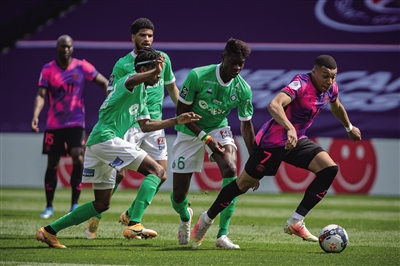 18日,在2020-2021赛季法甲联赛第33轮比赛中,巴黎圣日耳曼队主场以3∶2战胜圣埃蒂安队。图为巴黎圣日耳曼队球员姆巴佩(右一)在比赛中进攻。