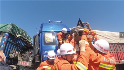 事故发生后,市消防救援支队左云大队的救援人员火速赶赴现场。由于驾驶室严重变形,加上被困司机身材高大,救援出现一定难度。救援人员先是破拆了驾驶室的操作平台,但还是无法抽出被困司机的腿,于是只好将座位和离合器破拆。经过半个多小时的努力,终于将被困者成功救出,抬进一旁等待的急救车里。