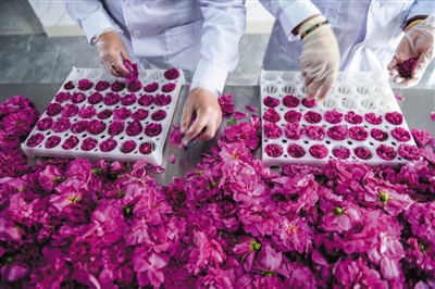 ▼4月20日,工作人员在长兴县泗安镇师姑岗村玫瑰花帮扶基地内分拣玫瑰花,准备用于加工。该基地采取“合作社+基地+农户”的方式,通过资金帮扶、技术指导、销售保障等方式,帮助农户稳步增收,做强美丽经济。