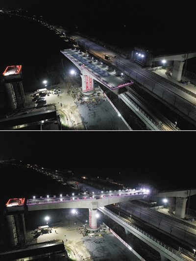 4月21日凌晨,由中铁四局承建的湖杭铁路大圩里特大桥上跨杭临城际铁路、杭瑞高速、G329国道连续梁逆时针转动82度,安全跨越既有线,实现精准对接到位,这是湖杭铁路首个成功转体的连续梁。