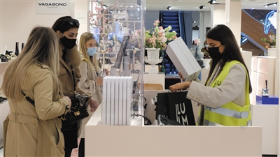 ◀ 4月21日,顾客在丹麦哥本哈根一家重新营业的大型购物中心的收银台结账。