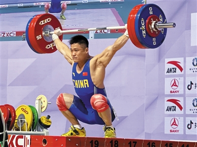 图为,中国选手吕小军在男子81公斤级抓举比赛中,以174公斤的成绩打破世界纪录。