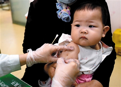 4月25日,在石家庄市桥西区裕西社区卫生服务中心,一名儿童在接种疫苗。